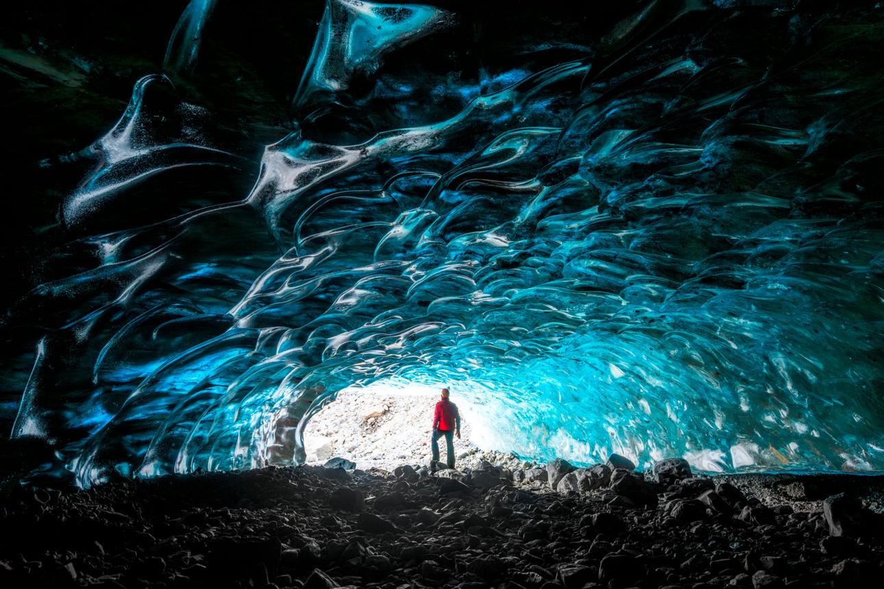Icelandās glaciers are some of the largest in Europe. Exploring an ice cave feels like stepping into a glowing blue crystal world.